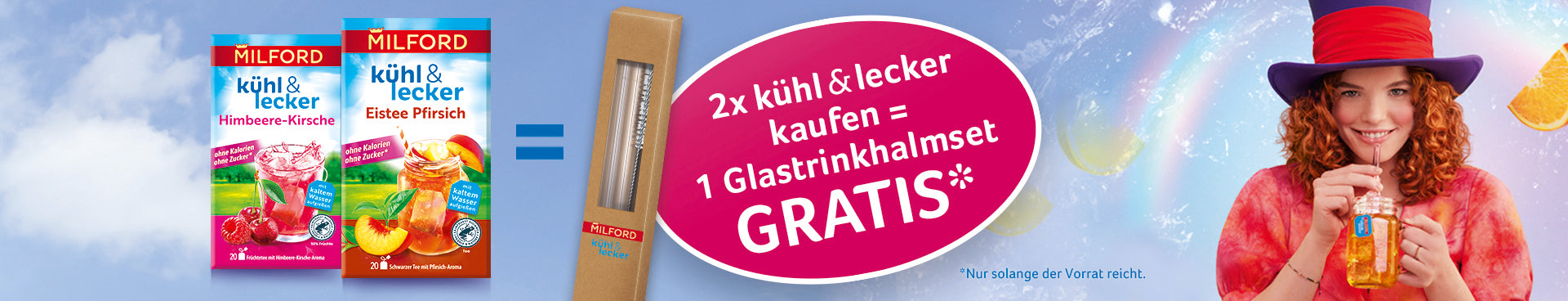 Die Teilnahme an der Aktion ist kostenlos, jedoch an den Kauf von zwei Aktionsprodukten während des Aktionszeitraums (01.07.2025 bis 31.12.2025) gebunden: Im MILFORD Onlineshop wird das Strohhalmset automatisch zum Warenkorb hinzugefügt, wenn mindestens zwei Packungen MILFORD kühl & lecker darin enthalten sind.